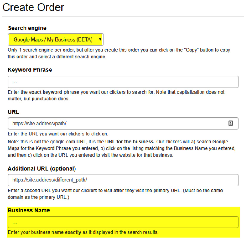 Regardless of which search engine you select, you will still enter a keyword for our clickers to search, and a URL for them to click on. If you select Google Maps/My Business you will also enter a Business Name to facilitate our clickers finding your listing.